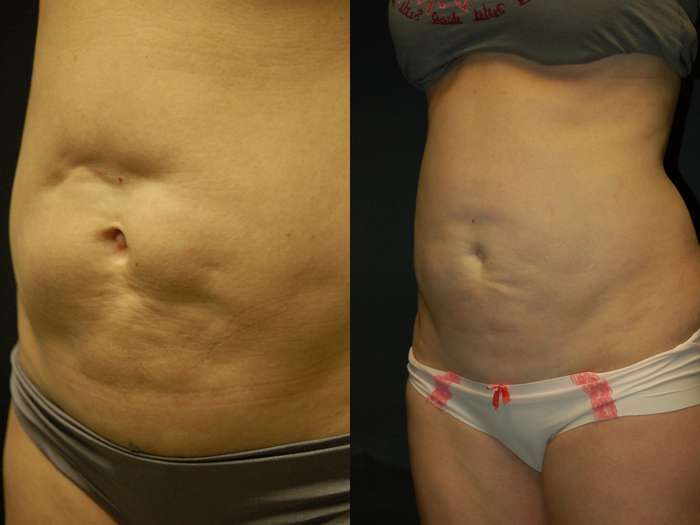 This forty-eight year-old woman had deformity of her abdominal wall after laser liposuction by a non-board certified doctor, with tethering of the skin to the abdominal wall, depressions and irregularity of contour and residual excess fat. Her first procedure with Smartlipo was done 18 months ago to even out the contours and free adhesions. The second procedure done 6 months ago included SAFE lipo, which is non-suction undermining with gradually increasing sizes of basket-tipped cannulas is to remove any high spots and transfer fat already present into depressions. Liposuction of the flanks and fat transfer of purified fat to fill the abdominal contour defects was done. Further improvement would be possible with another fat grafting procedure.